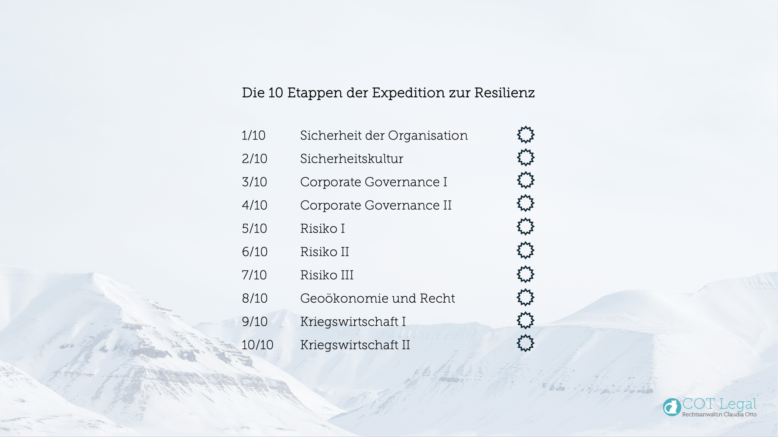 Diese Expedition zur Resilienz gibt Entscheiderinnen & Entscheidern in Organisationen Orientierung in Sachen Recht und Sicherheit. In 10 Etappen oder nach Bedarf.