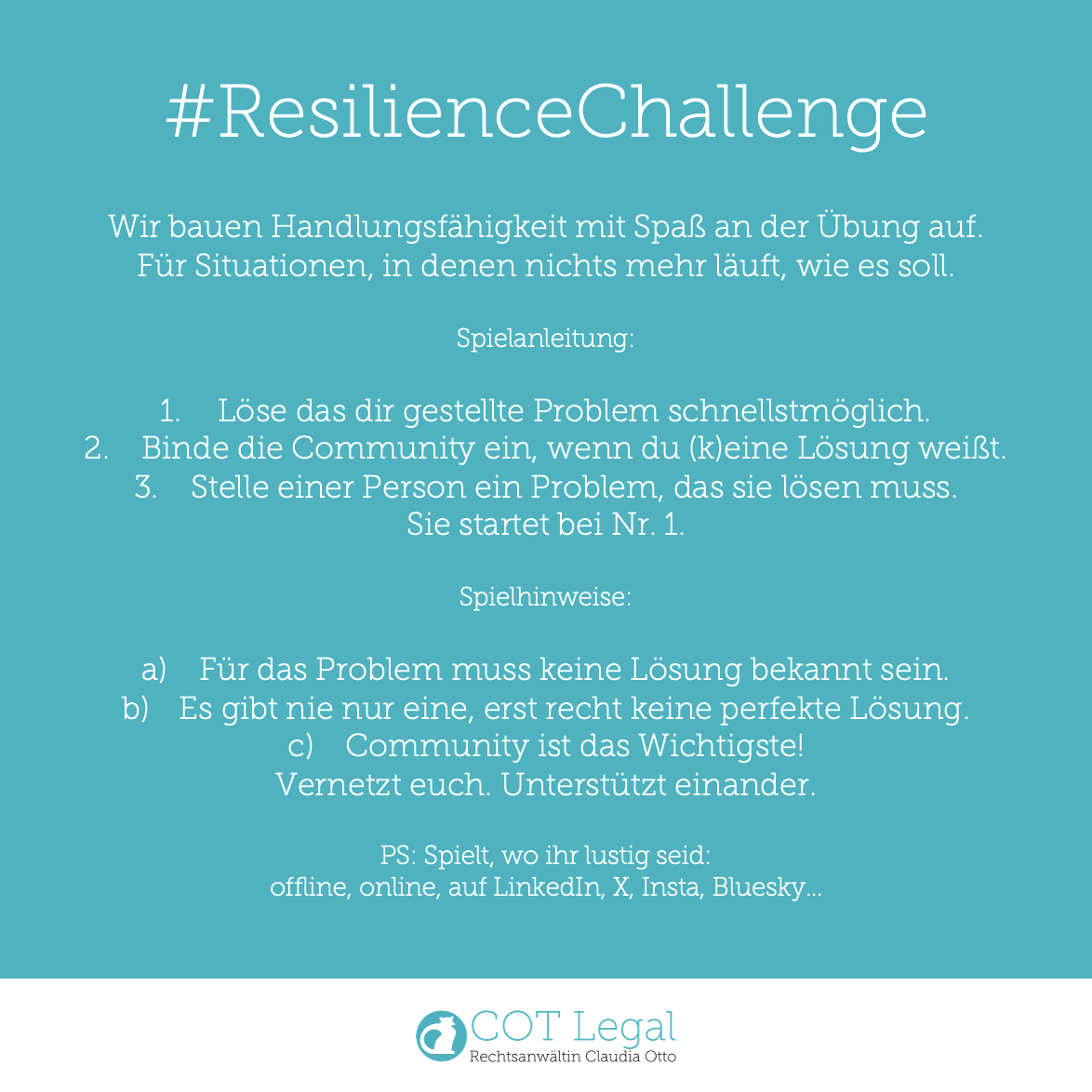Die #ResilienceChallenge ist ein von Rechtsanwältin Claudia Otto entwickeltes öffentliches Format zur spielerischen Stärkung der Resilienz von Einzelpersonen. Weil das Leben keine A-Team-Serie ist, in der jeder (Notfall-)Plan funktioniert, bedarf es der Flexibilität dank Kreativität und Wissen. Dabei ist klar, dass nicht jede Person alles wissen kann. Aber mit Spaß prägen sich Lösungen für Probleme leichter ein, die sich irgendwann einmal im echten Leben stellen können. Und wenn es nur das Wissen ist: Eine Community kann bei der Problemlösung helfen.
